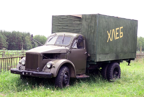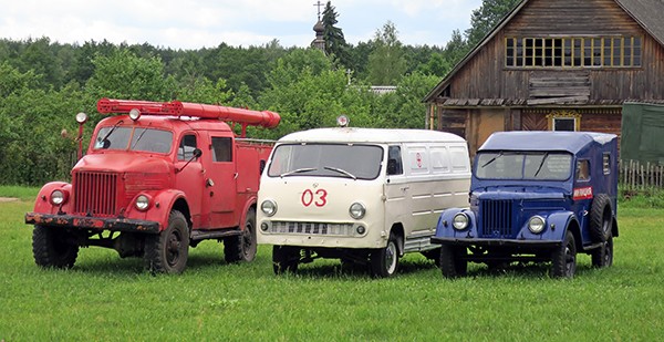 На лужайке в достаточно приличном виде небольшим рядком стоят наш легендарный советский "спецтранспорт": пожарная автоцистерна на шасси ГАЗ-63, санитарный ЕрАЗик и ГАЗ-69 в милицейской форме.