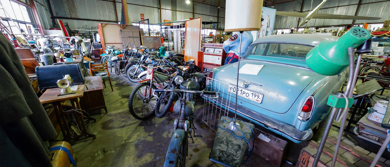 Under the roof of the museum you may see a handmade glider "Mechta" ("Dream"). In the far corner of the museum you may find a collection of rare motorcycles. Cars displayed in the museum are from private collections. Moreover on the territory of the museum visitors may see vehicles from storages of other museums. Our virtual tours gives you a good chance to see this unusual collection.