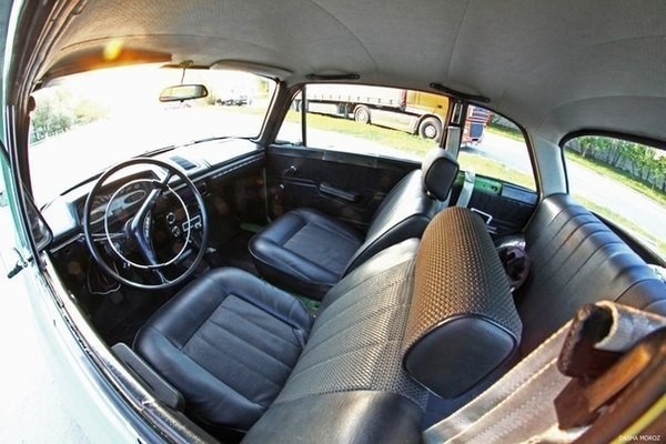 Салон, конечно, не аутентичный, но обновленный очень аккуратно, с использованием штатных оригинальных элементов интерьера: руля, приборной панели, зеркала заднего вида и даже салонных боковых светильников.