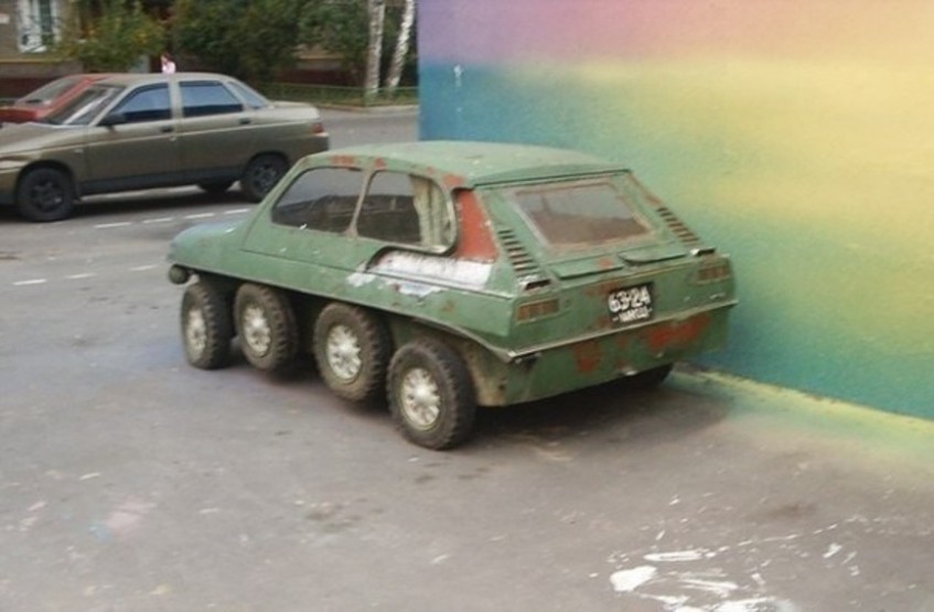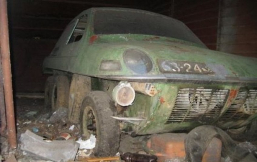 Другая находка тоже из Советских времен. Он простоял в гараже не менее 30-40 лет. Похож на самоделку, но интересно выполненную с поднимающимися двумя средними осями, превращающие 8-ми колесный вездеход в обычный внедорожник 4х4.