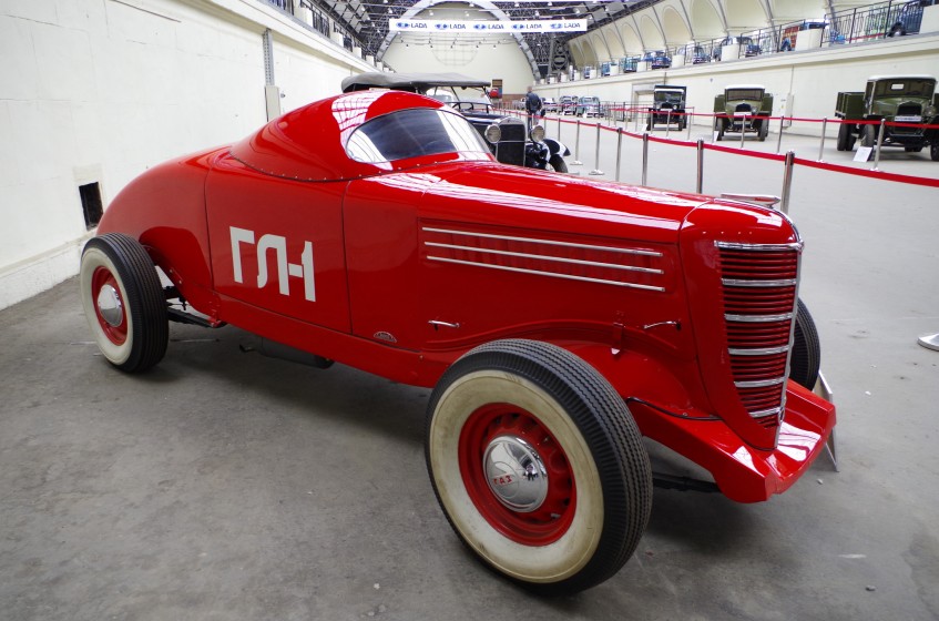 Знакомство с экспонатами начнем с самого эффектного экспоната - ГАЗ ГЛ-1 - первый советский гоночный автомобиль заводской постройки, выпущен на Горьковском автомобильном заводе предположительно не более чем в двух экземплярах.