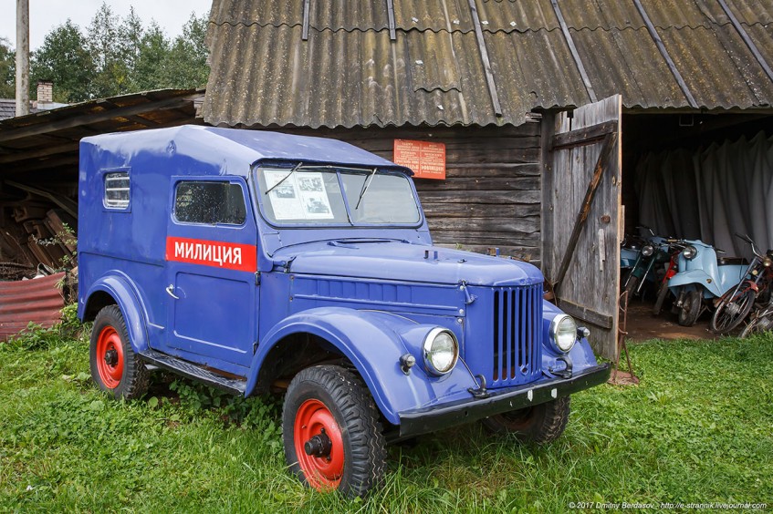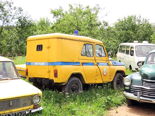 На лужайке в достаточно приличном виде небольшим рядком стоят наш легендарный советский "спецтранспорт": пожарная автоцистерна на шасси ГАЗ-63, санитарный ЕрАЗик и ГАЗ-69 в милицейской форме.