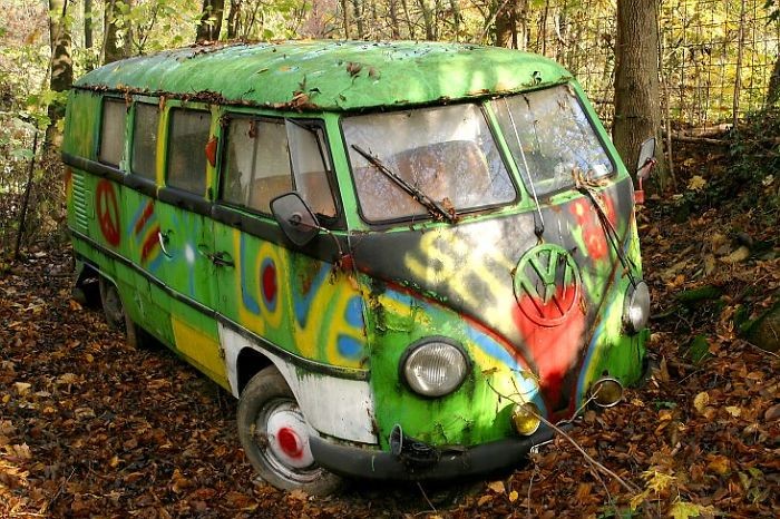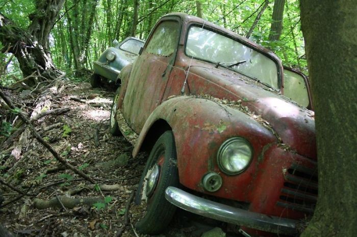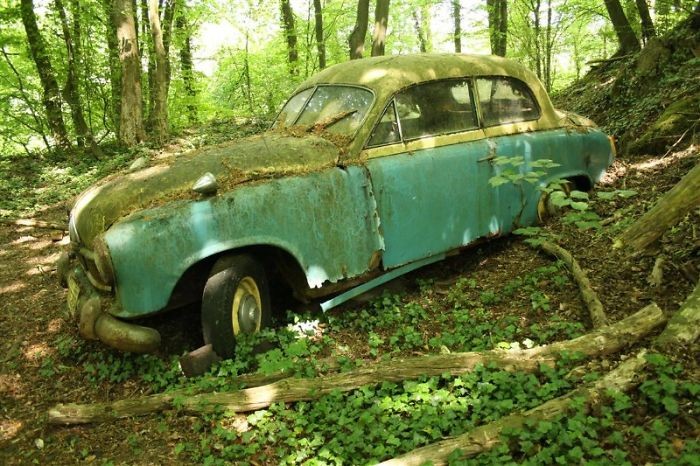 Вот в каком состоянии они к нему поступили, так и встроил он их в лесной ландшафт, оставив естественно стареть на природе. Получился такой своеобразный автомобильный сад Майкла Фролиха!