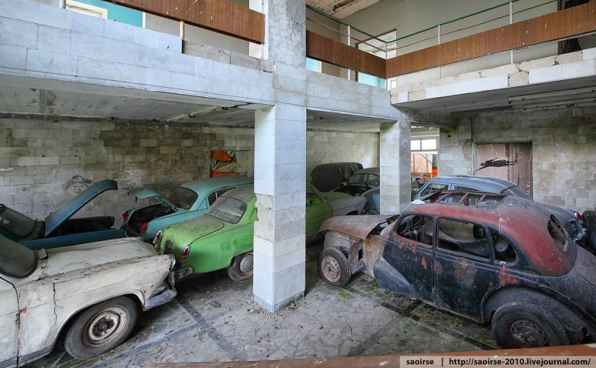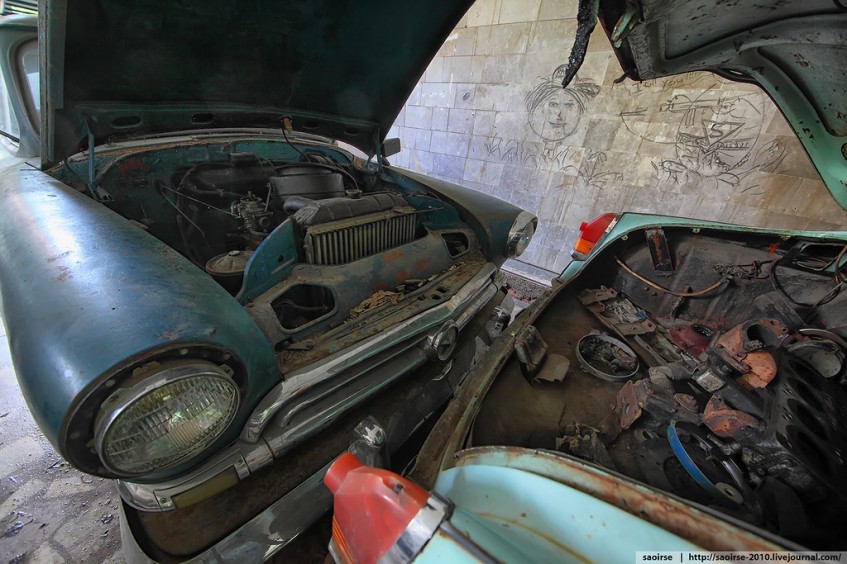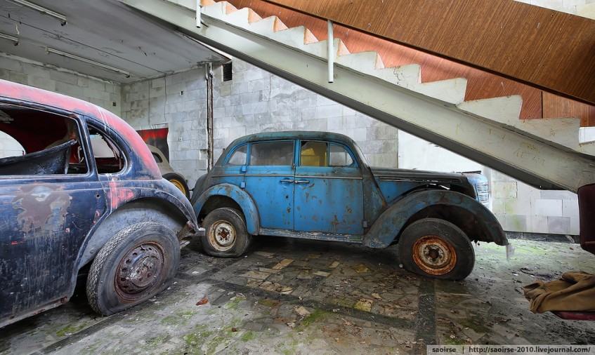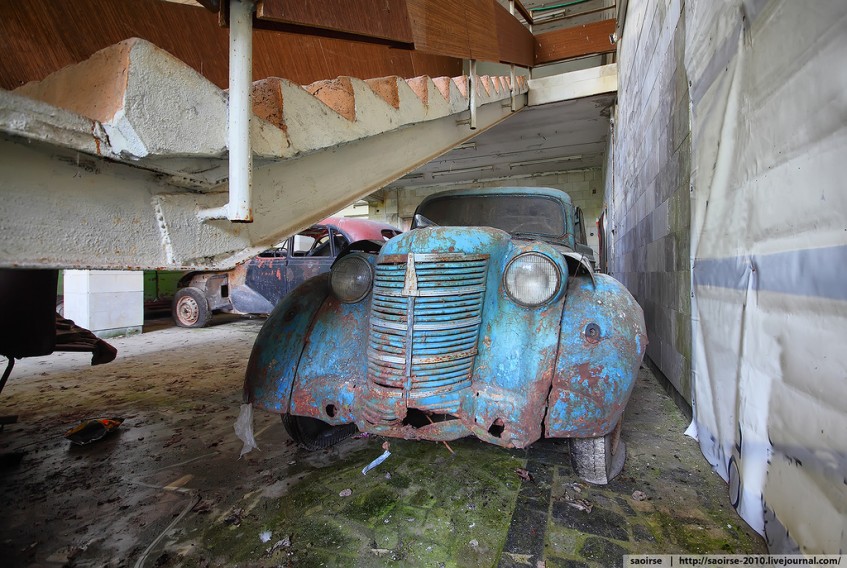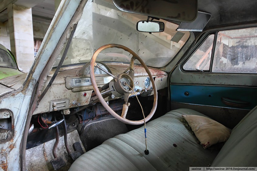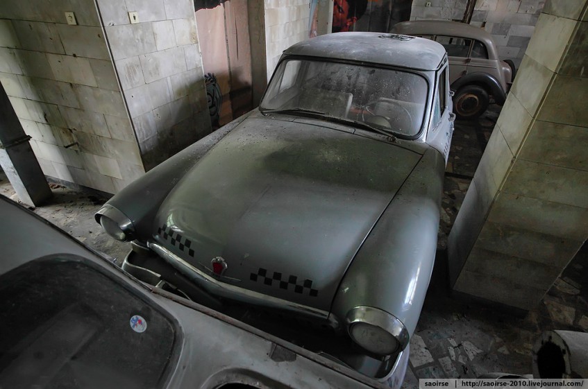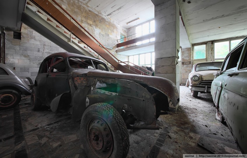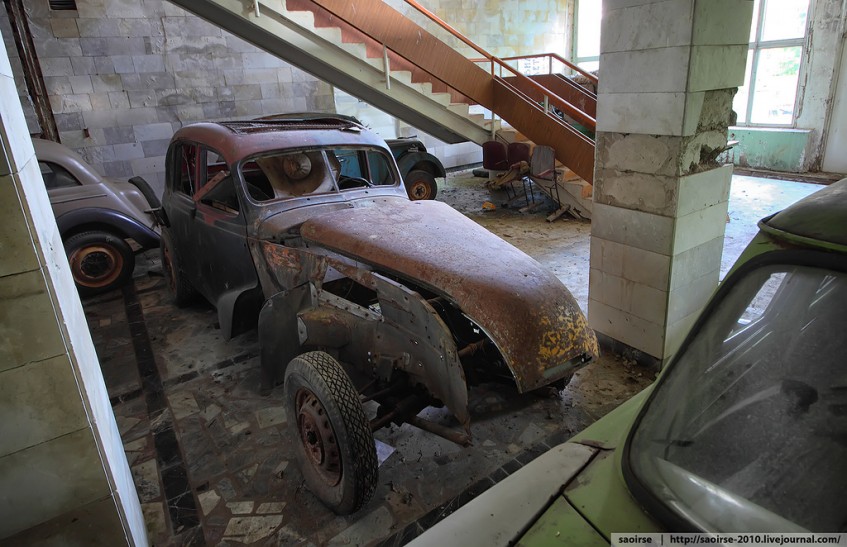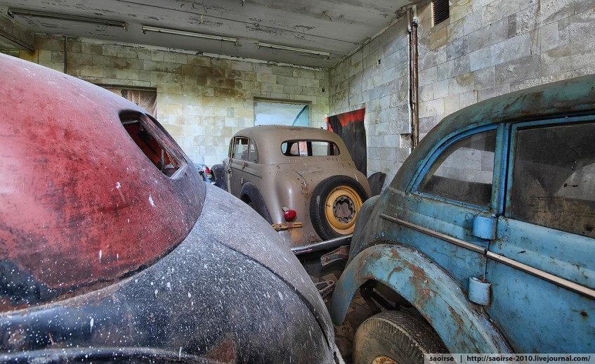 Пройдя через череду вот таких заброшенных помещений можно наткнуться на целый склад легковых ретро-автомобилей.