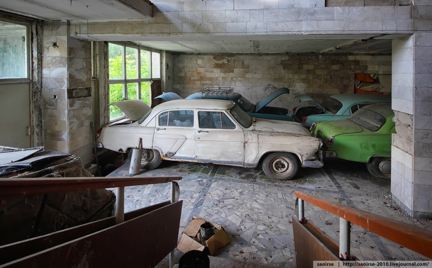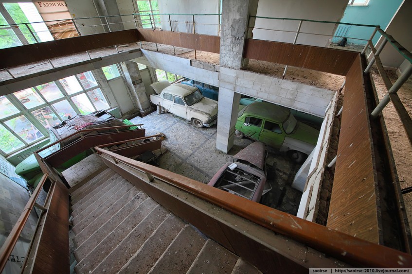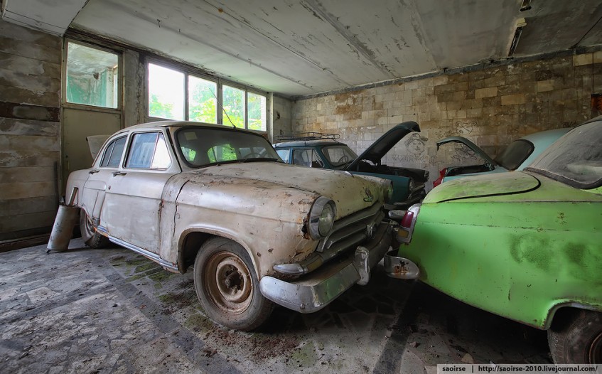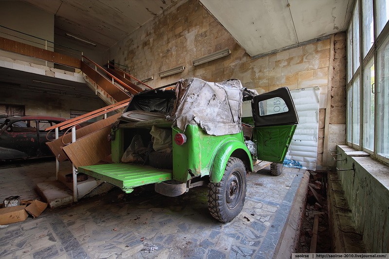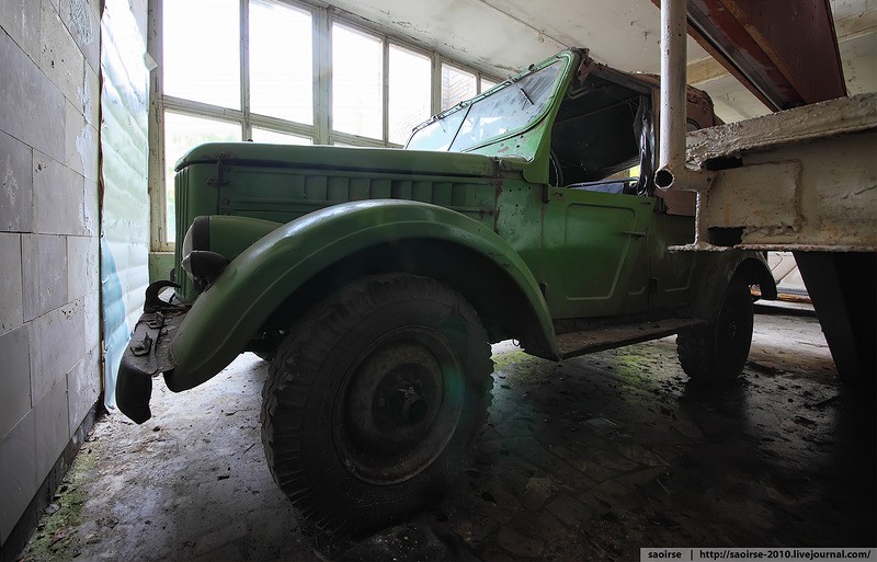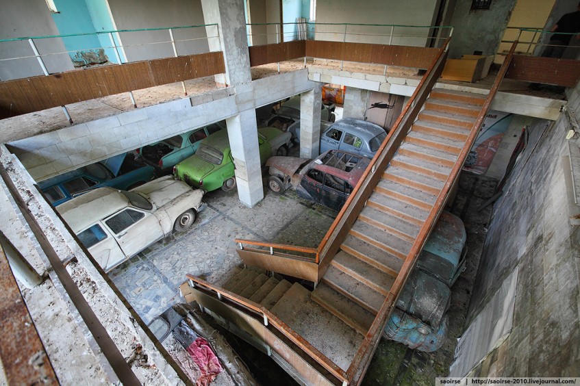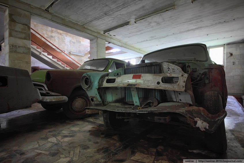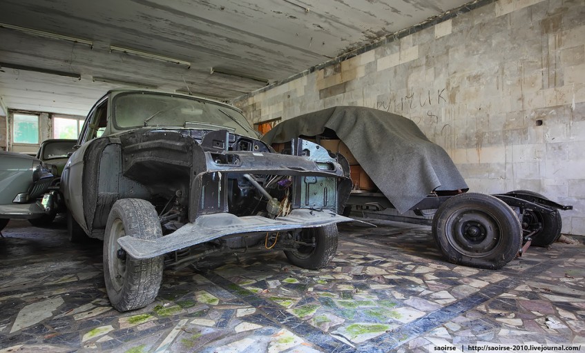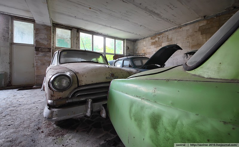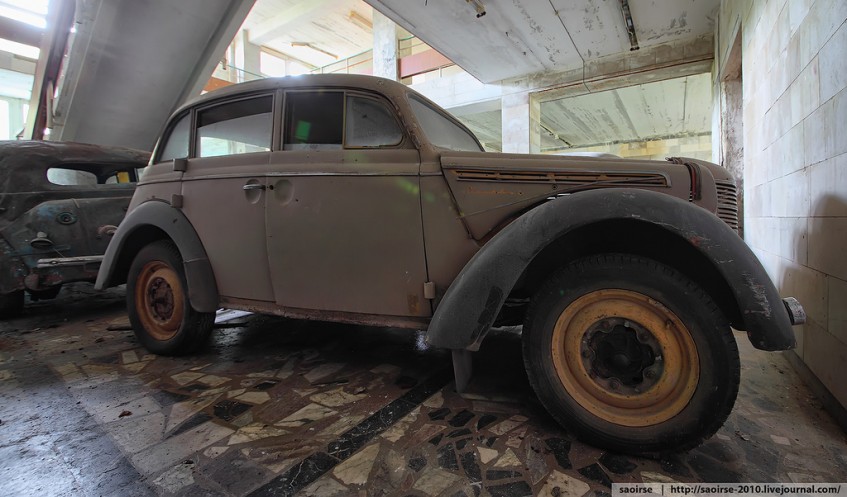 Пройдя через череду вот таких заброшенных помещений можно наткнуться на целый склад легковых ретро-автомобилей.