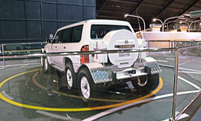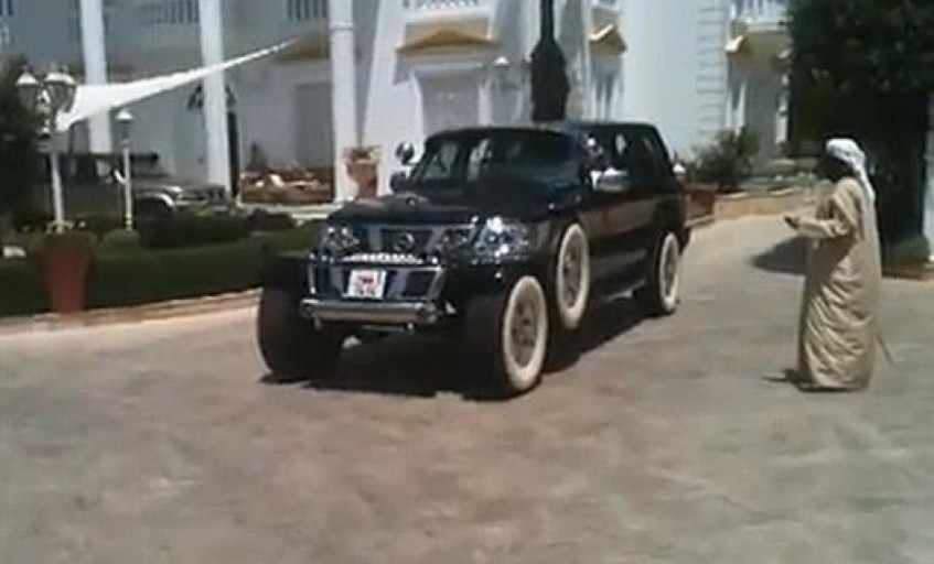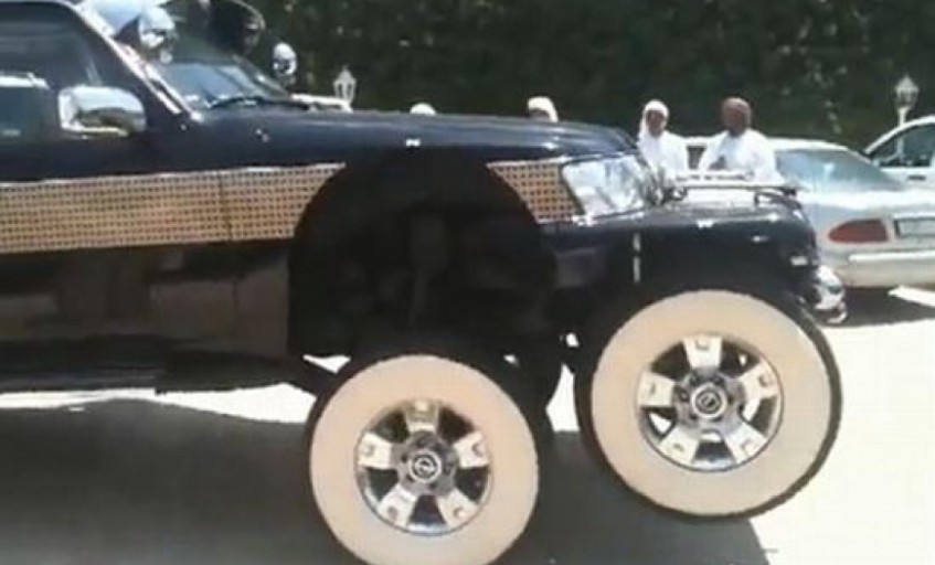 Но это еще не все . Подниматься могут как передние колеса, так и средние . Так при поднятии средней оси получается длиннобазный джип совсем в духе арабских шейхов.
