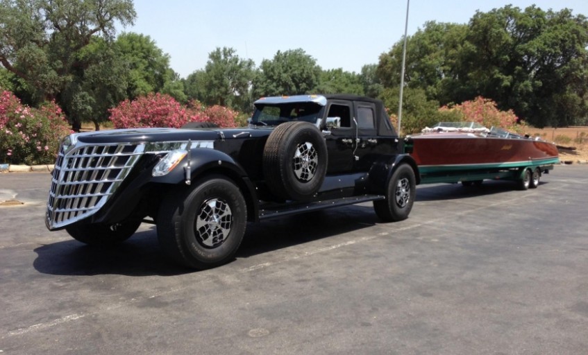 Два Jeep Wrangler , соединенные в один кузов по боковым сторонам . Выглядит несколько комично . Особенно спереди . Да и занимает это странное транспортное средство , аж, полторы полосы движения.