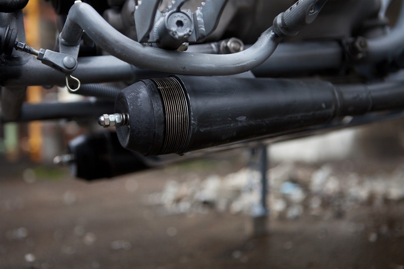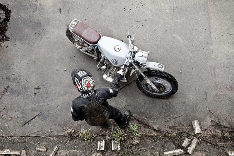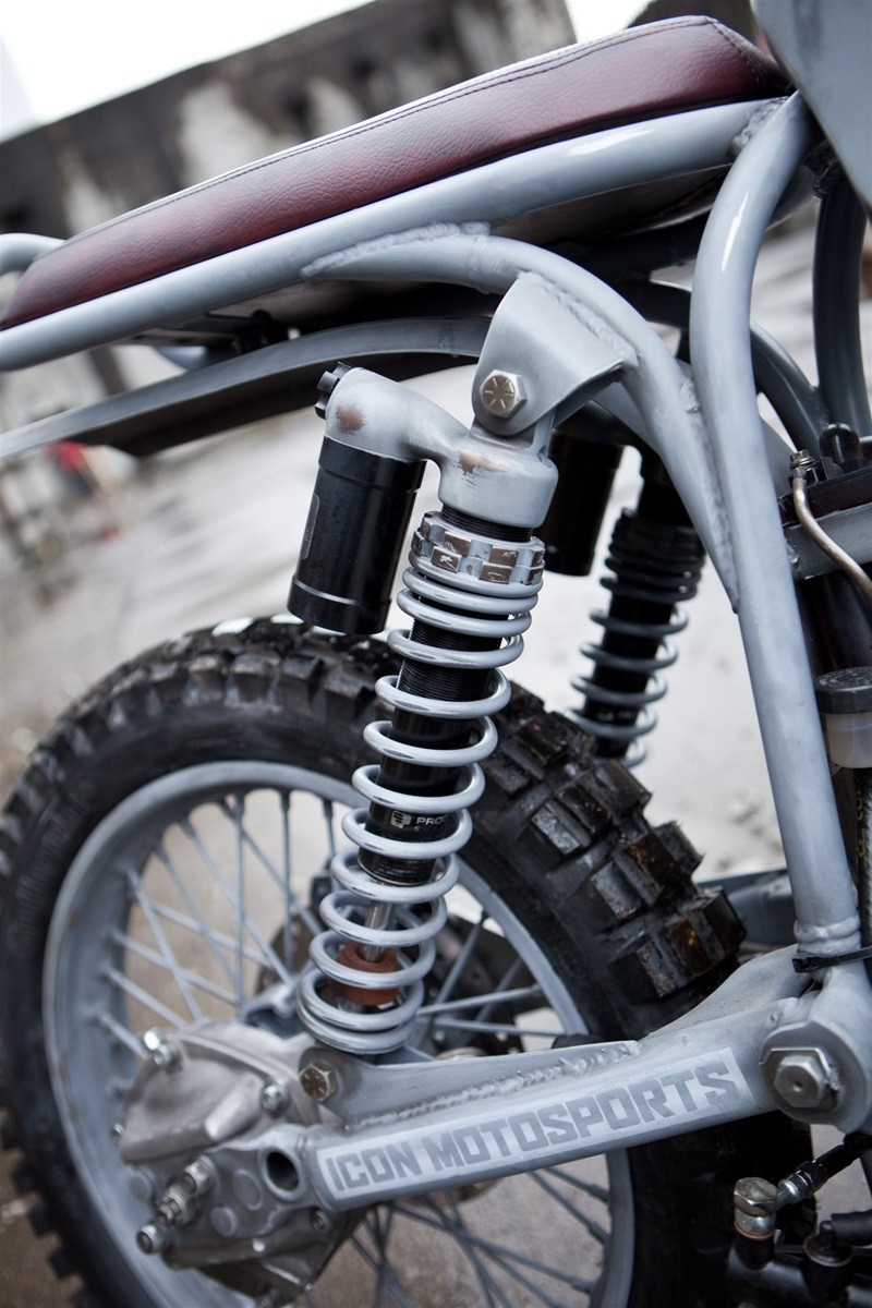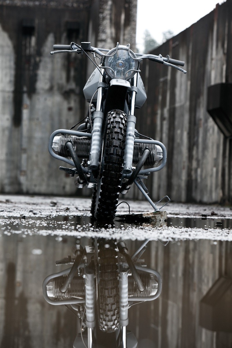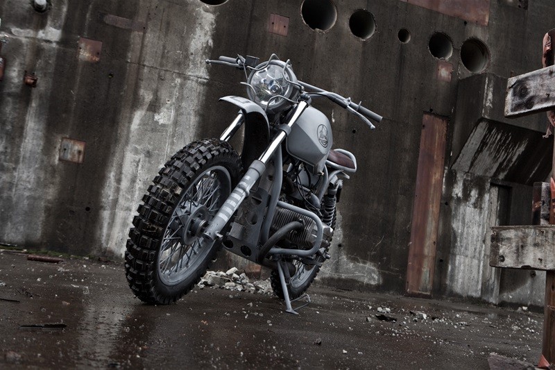 Байк имеет кастомную раму и подрамник, огромный топливный бак, специально изготовленные крылья ручной работы, внедорожный руль, защиту поддона картера, выхлопную систему Supertrapp, шины Continental TKC-80.