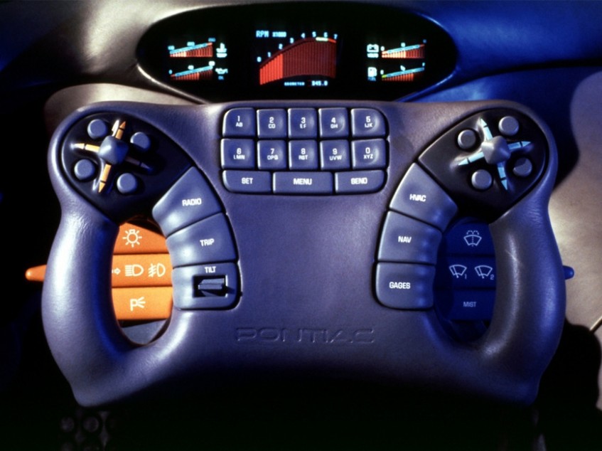 Руль от Pontiac Pursuit очень напоминает джойстик от игровой приставки. В нем есть даже телефонная клавиатура для звонков и отправки текстовых сообщений. И кроме этого, руль не имел прямой связи с колесами: за повороты отвечали электромоторы, причем поворачивали они все четыре колеса разом.