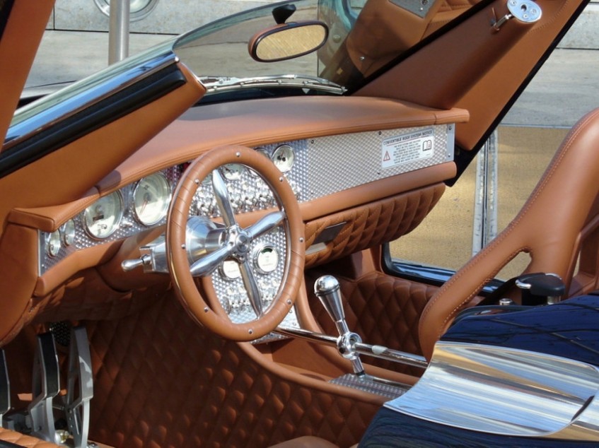 У открытого родстера C8 был уникальный салон. Каждая его деталь была сделана словно произведение искусства. Посмотрите, например, на четырехспицевый руль с кожаной отделкой и заклепками, напоминающий винт пропеллерного самолета.
