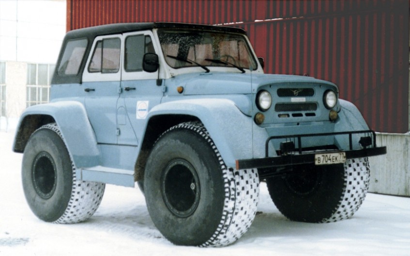 Это уникальная версия УАЗ с использованием шин низкого давления, производства НПФ ТРЭКОЛ, доработанных в НАМИ.
