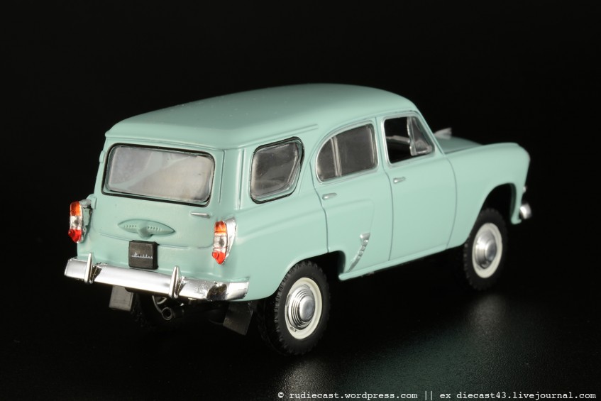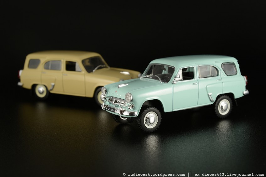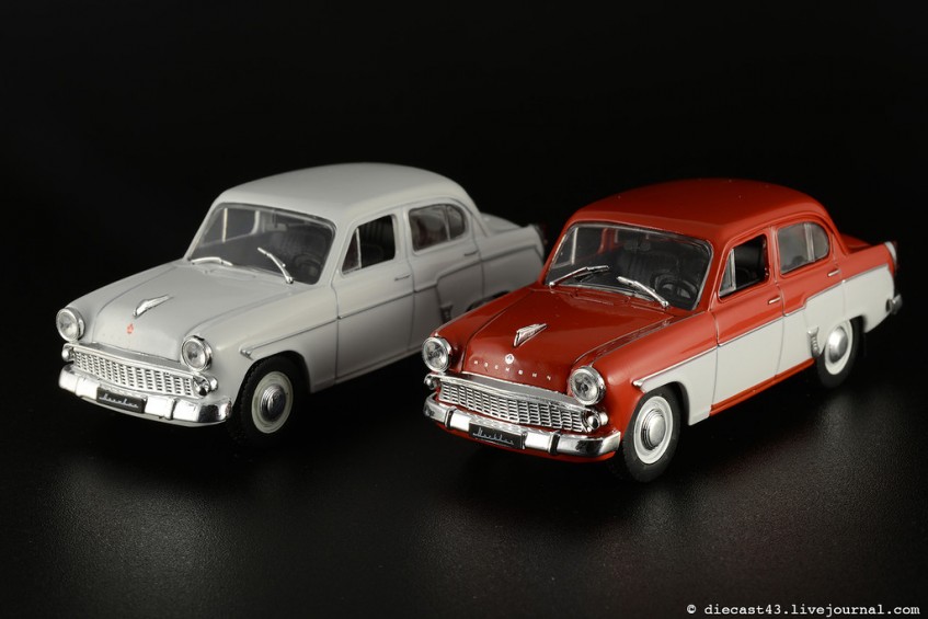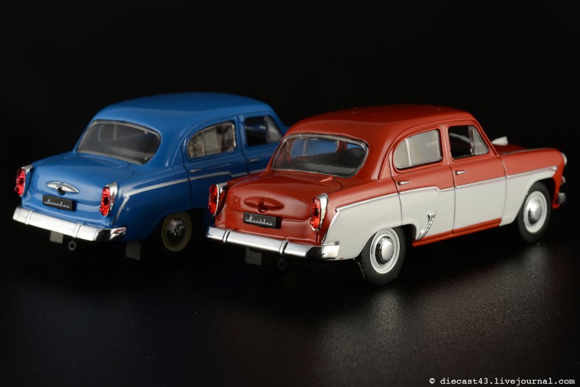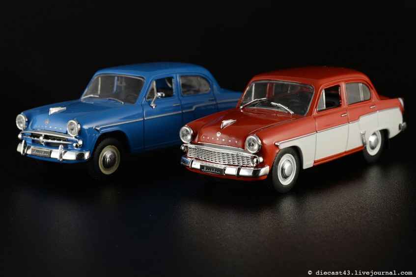 Голубой Москвич - более ранний вариант, а серый - последних лет выпуска этого поколения Москвичей.