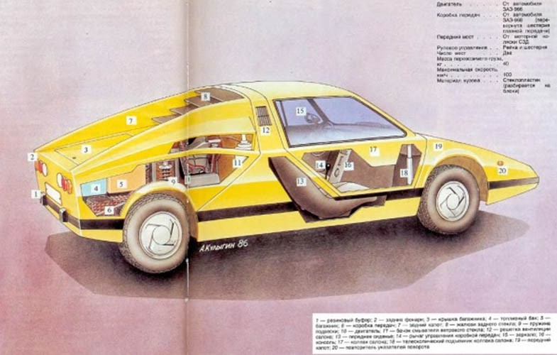 Компоновка "заднемоторная" - естественно перекочевала из донора - ЗАЗ-966. Салон двухместный, как полагается автомобилю с прицелом на "спортивность".