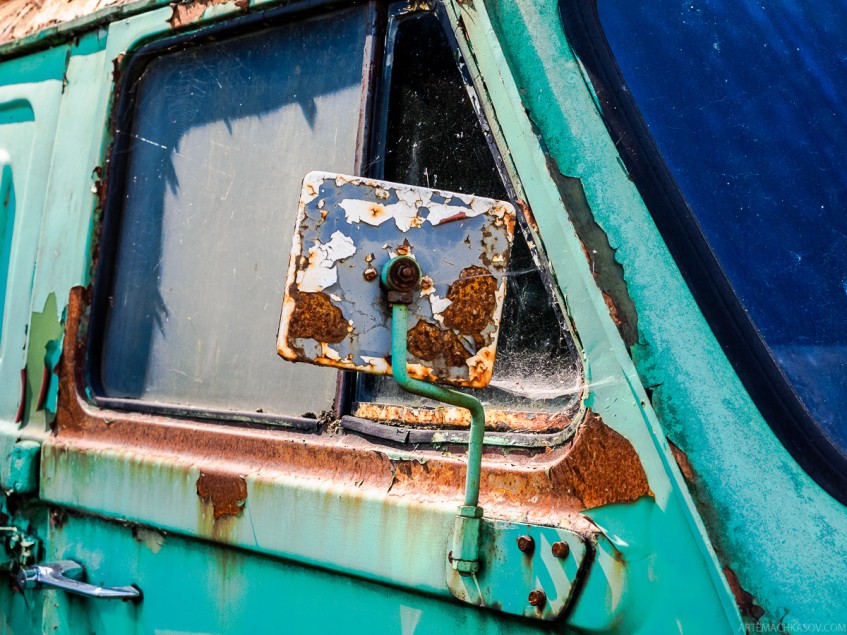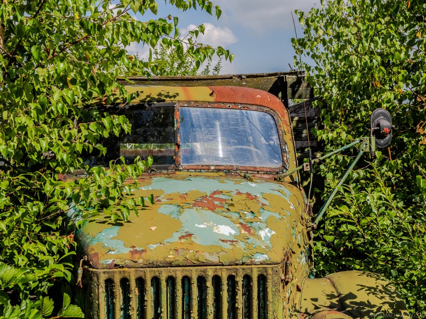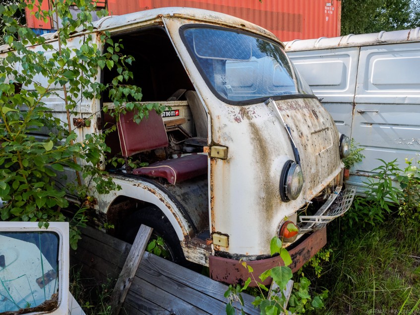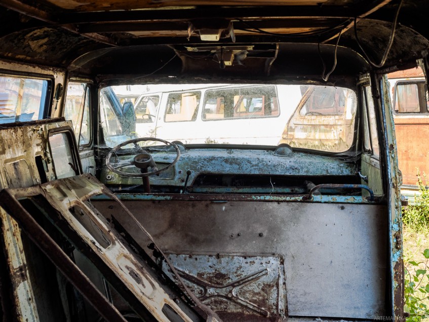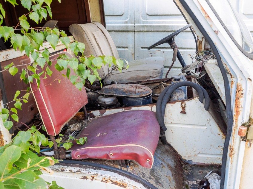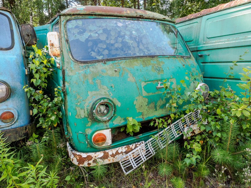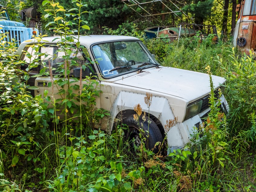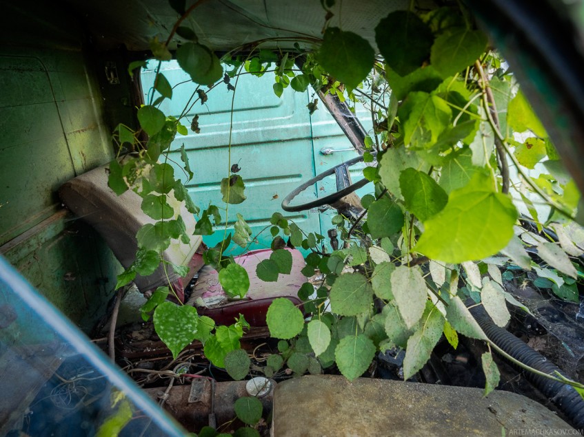 Как полагается на автомобильном кладбище, некоторые автомобили поросли растениями прямо через салон.