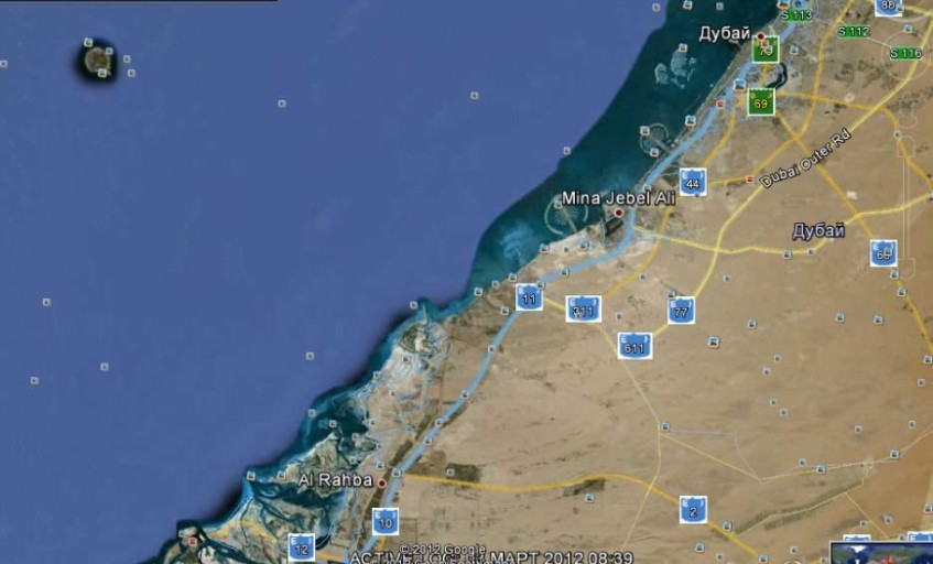 Полицейских на дороге почти не видно. Достопримечательностей почти тоже нет . Голая пустыня с редкими поселениями . Единственно только где-то на одной трети пути от Дубаи проезжаешь территорию свободно-экономической области Jebel Ali Free Zone. Это довольно большая территория ,примыкающая к порту , где располагаются офисы-склады многих больших международных фирм.