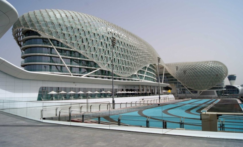 В этот день вся трасса была отдана для тренировок велосипедистов , которые двигались не только по самому кольцу , но и на прилегающих подъездных дорогах , для чего полицейскими было организовано специальное движение по выгороженным дорожкам. Но центром и изюминкой всей трассы ( кроме паддоков и центральной трибуны) является отель 5* Yas Viceroy Abu Dhabi ( www.viceroyhotelsandresorts.com ), располагающийся прямо на трассе и имеющий террасы и виды из окон номеров на кольцо , что дает возможность наблюдать за ходом гонки , не выходя из номера и потягивая Мартини.