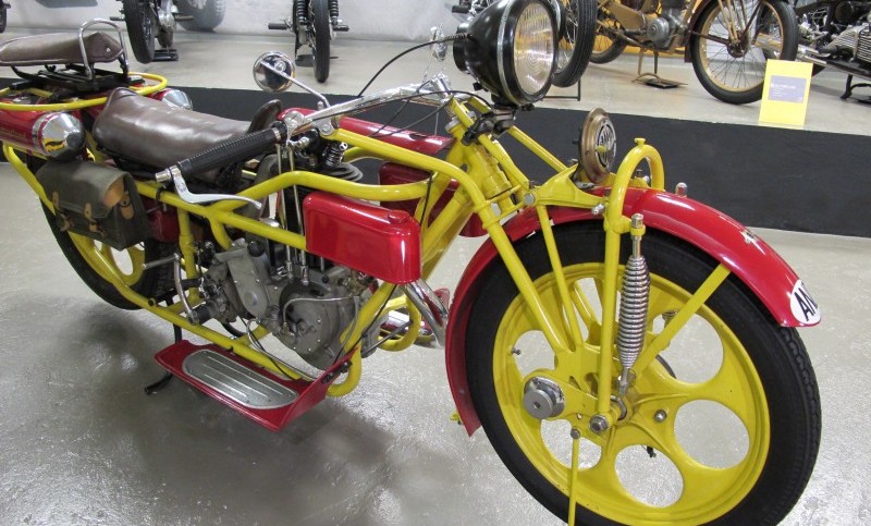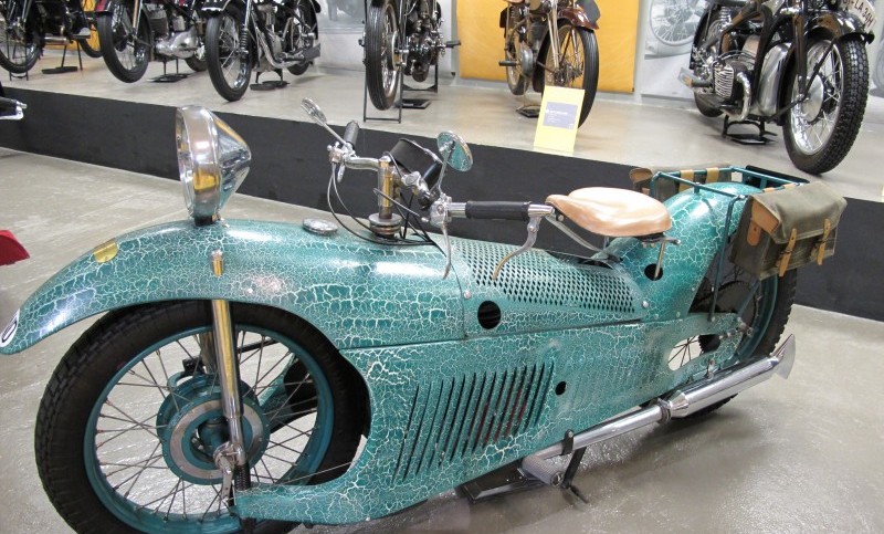 Этот байк - изюминка экспозиции. Он несет немецкий бренд Bohmerland, модель 600 B Lantouren, сделанный в 1927 году. Это один из самых необычных и дорогих мотоциклов в мире, которые очень ценятся коллекционерами. Мотоциклы Bohmerland производили всего 5 лет - с 1925 по 1930 год. Компания выпускала три различные версии: 2-местную Tourden, 3-местную Lantouren и гоночную Jubiele.