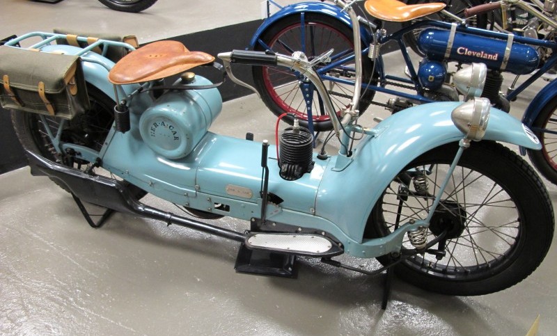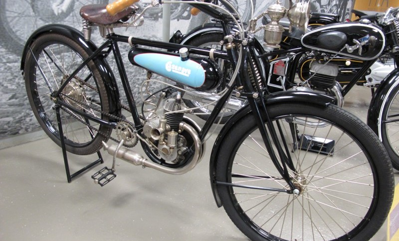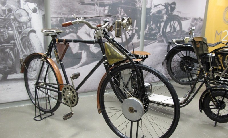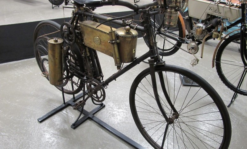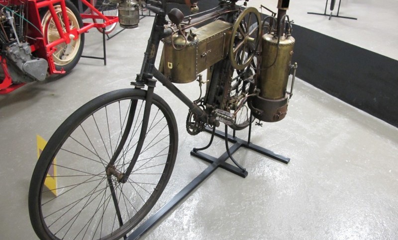 Стимпанковский ранний мотовелосипед F.Diamant, произведенный во Франции в 1900 г. Отличается очень необычным паровым двигателем с хитрой процедурой подготовки к рабочему состоянию: сначала воду в 10-литровом баке нужно было вскипятить, затем подождать 30 минут, пока поршень сможет работать в оптимальном режиме. Время работы составляло всего 35-40 минут. Это единственный из известных сохранившихся экземпляров.