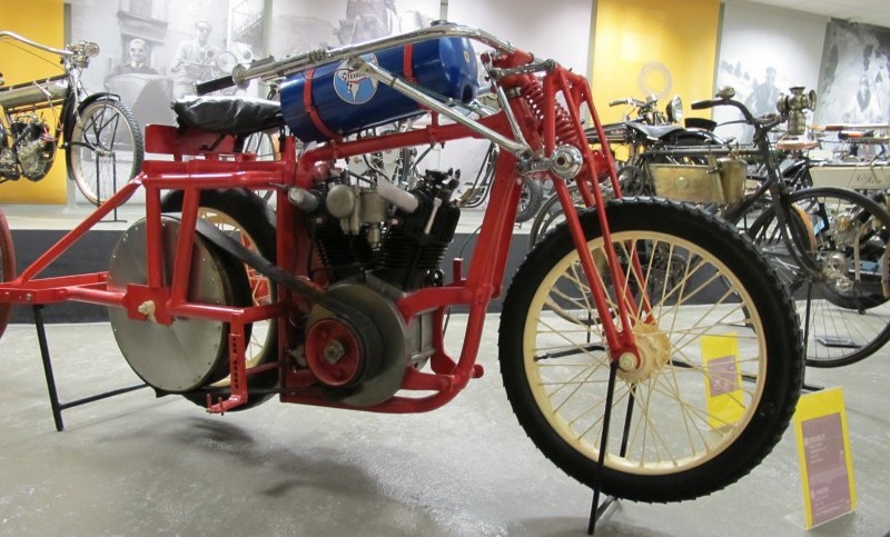 Гоночный мотоцикл с ременным приводом и огромным топливным баком на самом верху рамы.
