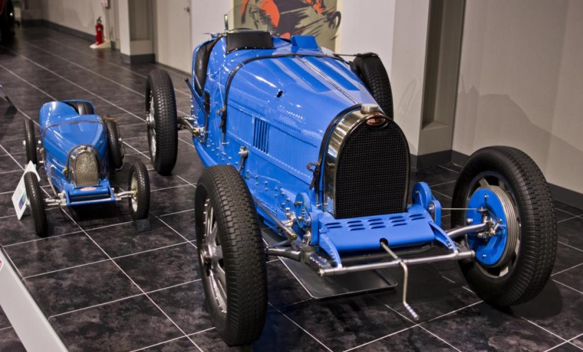 Bugatti Type 35B 1926 года с детской копией этой же модели. Один из самых известных автомобилей компании, в самом популярном цвете. Двигатель выдает 130 л.с. и он на 200 кг легче Mazda MX-5. И это в 1926 году.