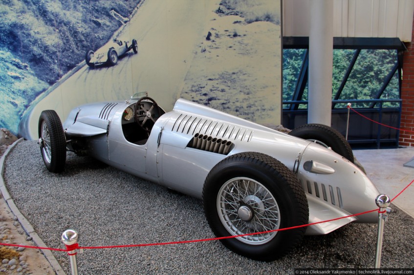Сразу скажу - это реплика. Отличная копия немецкого гоночного автомобиля Auto Union V16 typ C/D, 1938 года выпуска, созданный для соревнований по горным трассам. Он оснащен 16-цилиндровым двигателем мощностью 520 л.с.! Знаете сколько расходовал такой агрегат? Не менее 60 л/100 км. Кстати, оригинальный двигатель был разработан самим Фердинандом Порше. В 1945 году автомобиль был вывезен в Москву в качестве трофея, но в 1976 году его чуть было не распилили на металлолом. От печальной участи автомобиль спас председатель рижского Клуба антикварных автомобилей Виктор Кулберг, который и доставил машину в Ригу. Состояние автомобиля было плачевным, но его историческая ценность говорила сама за себя. О находке вскоре узнала компания Audi AG и выкупила оригинал у Виктора. Взамен Рижский моторный музей получил полностью аутентичную и функционирующую копию, изготовленную английской фирмой Crosthwaite & Gardiner в 1997 году, которая также занималась реставрацией оригинала для Audi AG.