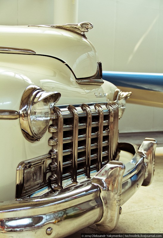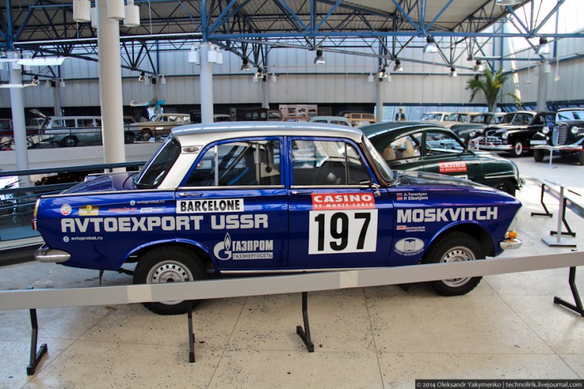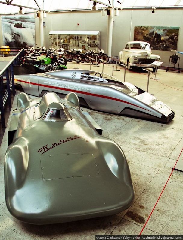 На переднем плане - Пионер - 2М, первый советский газотурбинный рекордный автомобиль, построенный в 1961 году в Москве. Он сделан в эпоху увлечения газотурбинными моторами и проводился в движение двумя турбинами, мощностью по 80 л.с. каждая, расположенных по сторонам от водителя. Согласно регламенту автомобили не могли даже частично использовать реактивную тягу. Для этого выпускная система направляла отработавшие газы перпендикулярно направлению движения автомобиля. Для уменьшения веса, кузов автомобиля сделан из алюминия, а колесные диски из магниевого сплава. В 1963 Пионер - 2М установил абсолютный всесоюзный рекорд скорости, достигнув 311,4 км/ч. Всего этот легендарный автомобиль установил 13 всесоюзных и 7 мировых рекордов скорости.