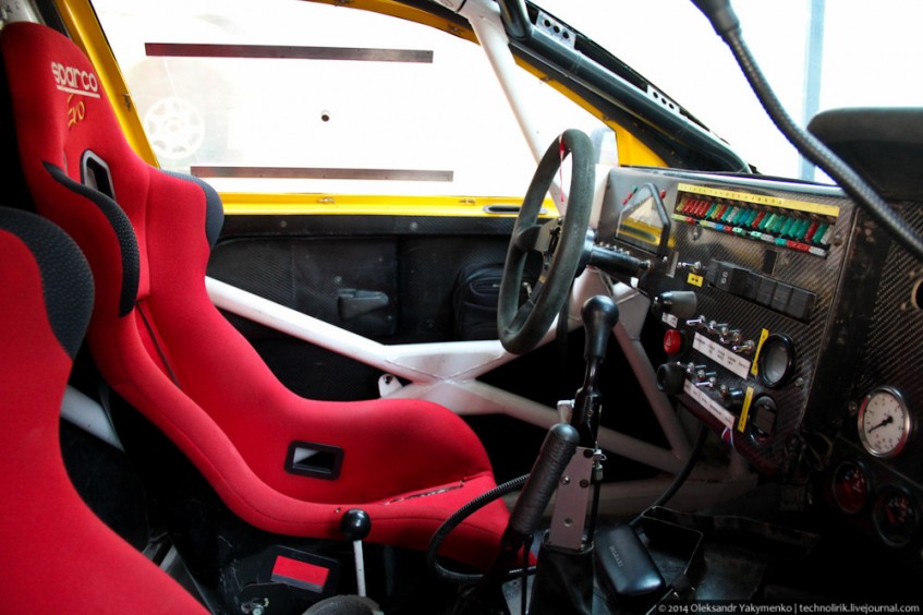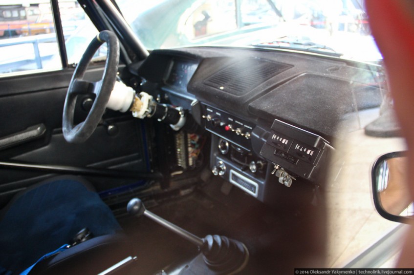 Интерьер раллийного Москвича смотрится необычно со спортивным рулем.