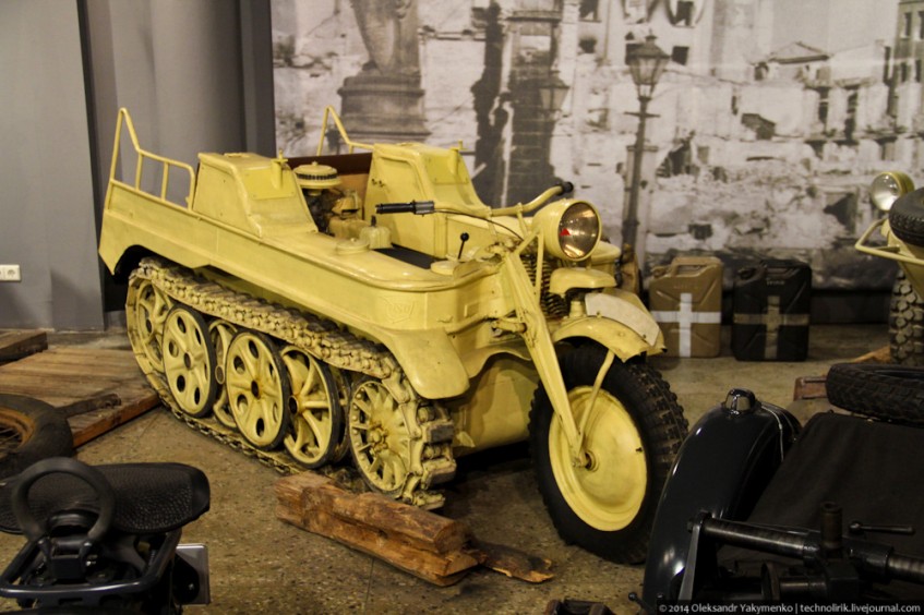 Еще один необычный немецкий военный экспонат - трехместный легкий тягач NSU HK 101, 1942 года выпуска. Его применяли для буксировки артиллерии, перевозки негабаритных грузов и прокладки кабельных сетей. Его изначально разрабатывали с учетом возможности перевозки в салоне грузового самолета Junkers Ju 52. Данный экспонат был участником боев в "Курляндском котле" 1944-1945 годов.