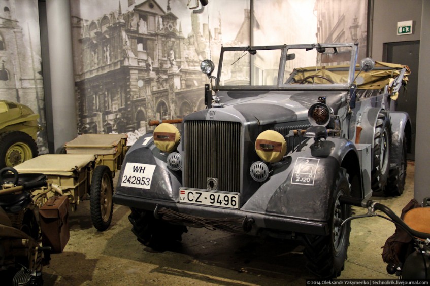 Штабный полноприводный автомобиль повышенной проходимости Horch 901. Производился в 1937 - 1943 годах для немецких офицеров штаба и служебных нужд фельдмаршалов. Данный автомобиль был участником военных действий на Восточном фронте в том числе боев в "Курляндском котле".