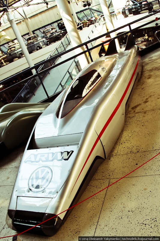 Рядом стоит рекордный автомобиль из Германии ARVW (Aerodynamic Research Volkswagen), сделанный в 1980 году и установивший абсолютный рекорд скорости для дизельных автомобилей, разогнавшись до 362 км/ч. Но установка рекорда максимальной скорости была непервостепенной задачей. Цель звучала так: проехать как можно большее расстояние на высокой скорости, при этом израсходовав как можно меньше топлива. Именно поэтому для ARVW использовали 6-цилиндровый дизель от грузового автомобиля, мощность которого повысили до 175 л.с. Кузов сделан из пластика, коэффициент аэродинамического сопротивления которого удалось довести до 0,15. На скорости 250 км/ч автомобиль расходовал лишь 6 литров топлива на сотню километров.