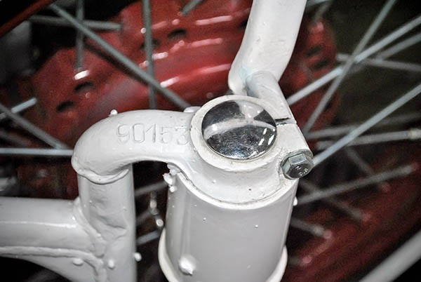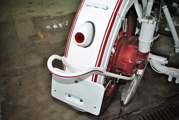 Но дизайнерская покраска в чистый белый цвет с "пинстрайпинговыми"акцентными линиями в вишневом цвете очень оживили старый мотоцикл.