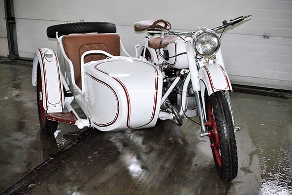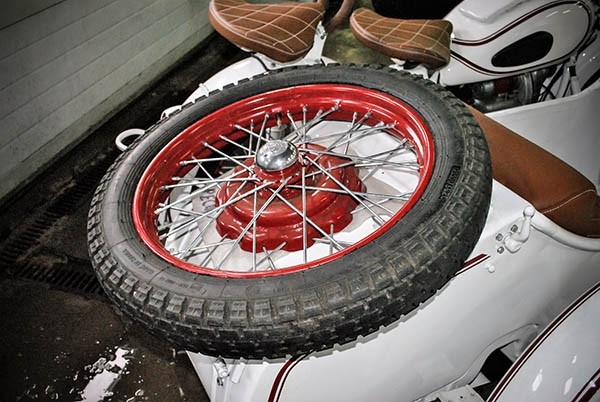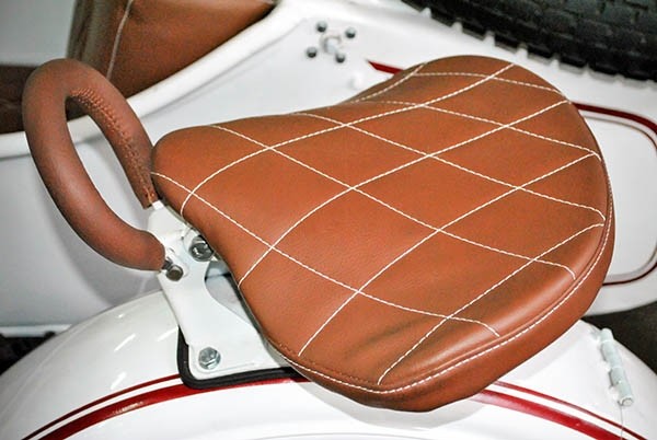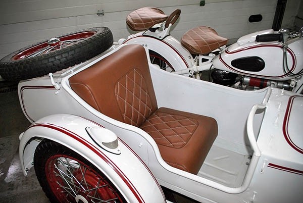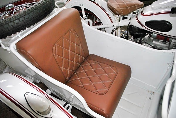 Сиденья на мотоцикле, ручки и кресло в коляске обшиты качественной сверло-коричневой кожей с белой отстрочкой.